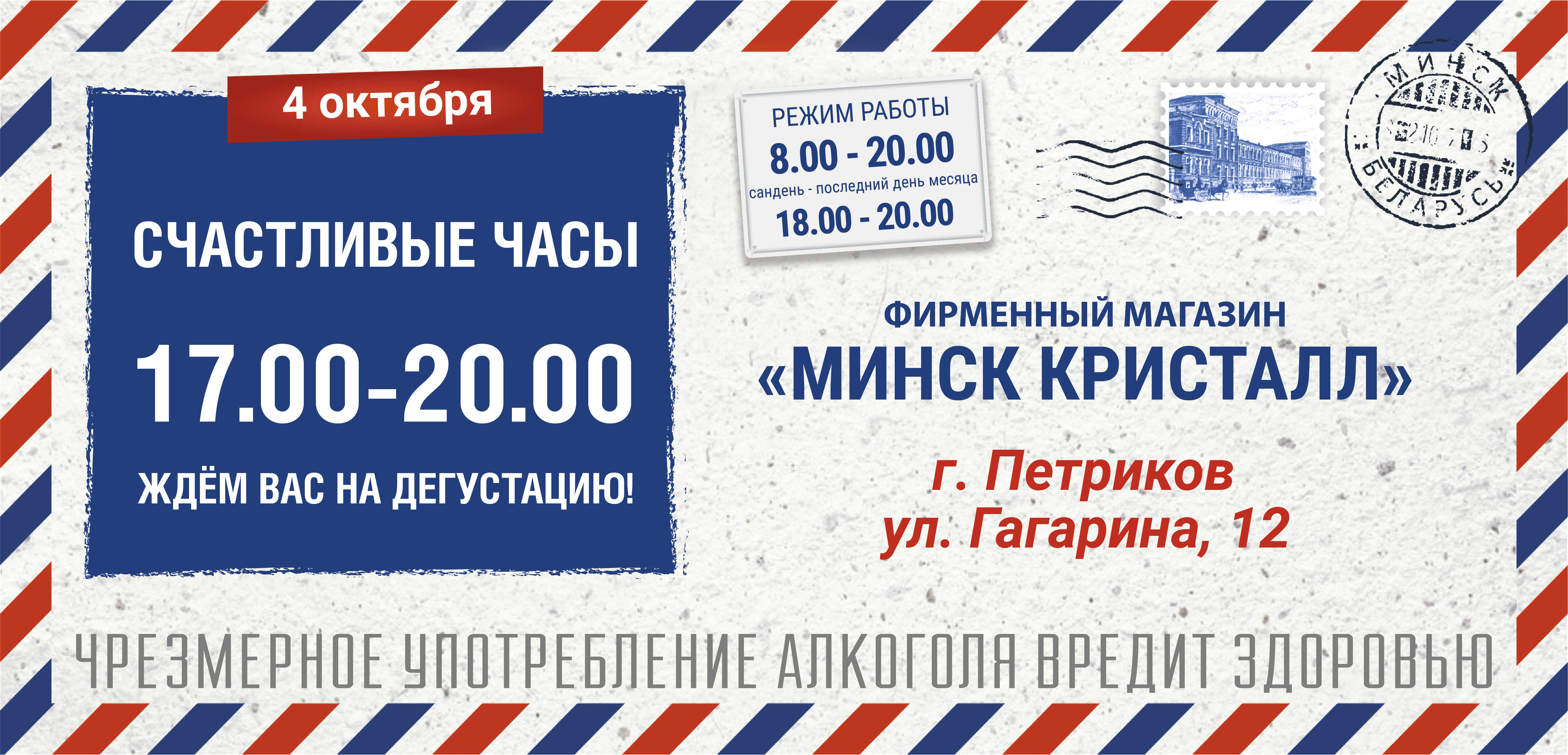 Приглашаем посетить фирменный магазин «Минск Кристалл» по адресу: г. Петриков, ул. Гагарина, 12. Работает без выходных с 8.00 до 20.00.